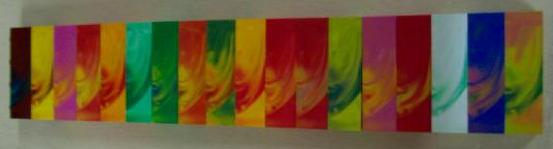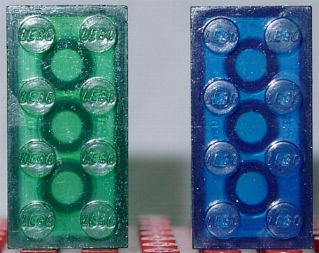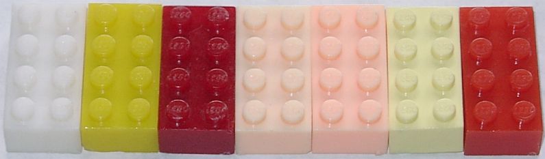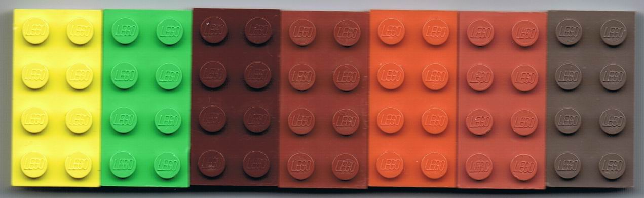 LEGO Test stenen met LEGO logo op de noppen: (Eerste rij is de kleur sterk doorgemengd, tweede rij is semi-transparant, laatste 2 stenen zijn transparant)