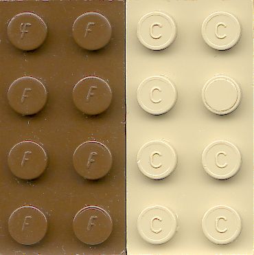 Verder maakte Bayer ook LEGO stenen, met de opdruk A, B, C, D, E of F op de noppen.