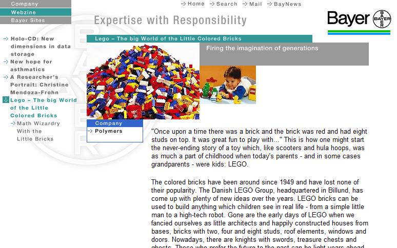 Bayer's Polimeren Divisie levert de granulaat korrels die nodig zijn voor de productie van LEGO stenen. LEGO betrekt haar grondstof exclusief van Bayer, en de samenwerking is al erg lang een feit. Bayer en LEGO hebben in de jaren 1962 tot 1965 testen gedaan met het ABS plastic. Er zijn allerlei LEGO stenen in veel verschillende kleuren geproduceerd. Veel kleuren zijn nooit op de markt gekomen. Tot voor kort was er weinig echt bewijs dat Bayer de grondstof voor LEGO heeft geproduceerd, maar dankzij Maxx hebben we nu een advertentie waarin Bayer zelf aangeeft de grondstof voor LEGO te produceren!