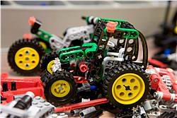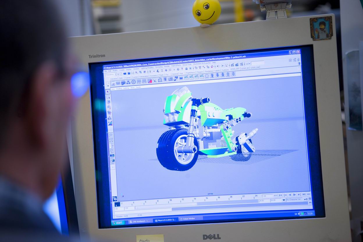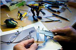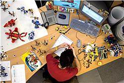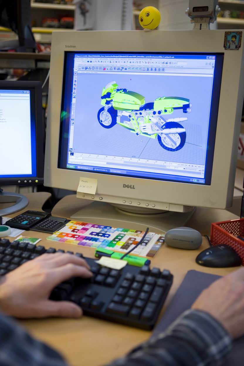Afbeelding 7/8 (Links): Na het ontwerpen op de computer gaat een 'disigner' (= ontwerper) aan de slag: hij bouwt het getekende model met echte LEGO elementen.